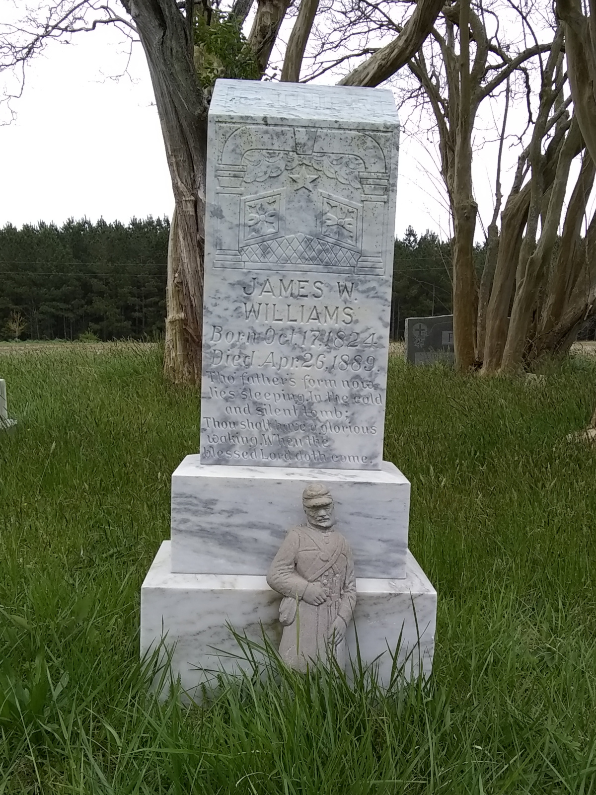 The headstone of my great-great-great-grandfather, James Williams (1824-1889), with a “Johnny Reb” statue at its base.