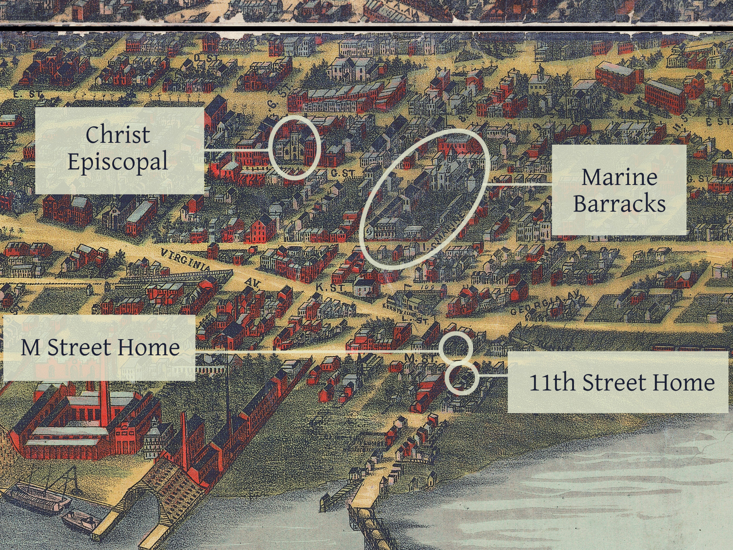 Locations in the Navy Yard area, circa 1883, per Adolph Sachse’s map, marked and annotated.