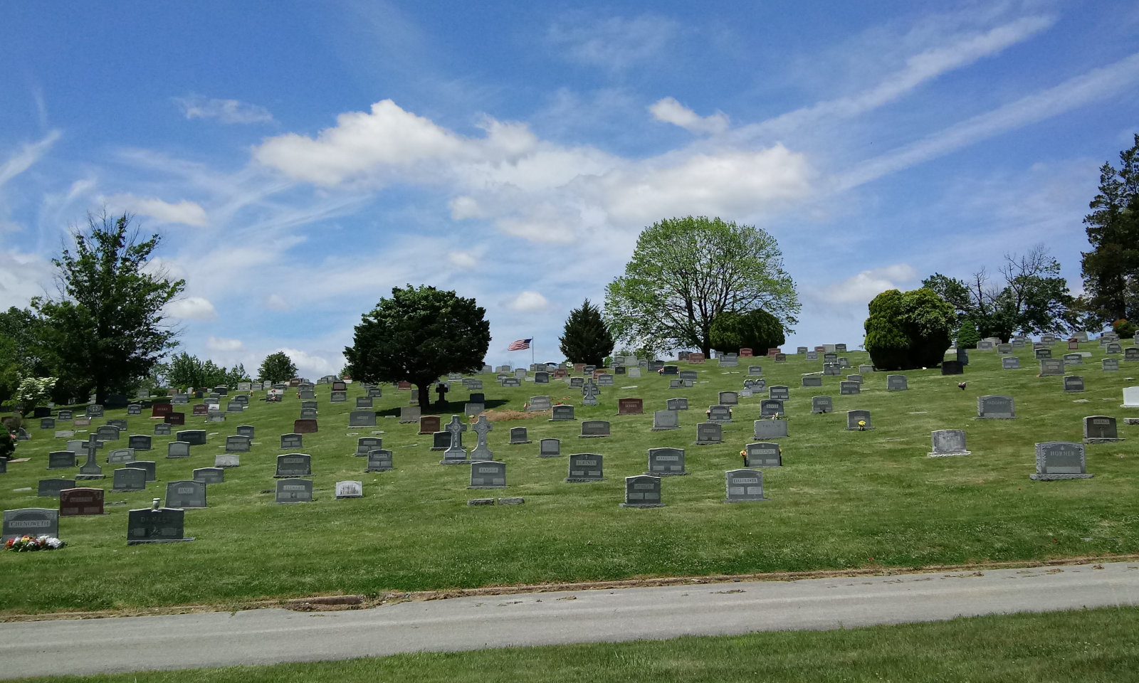 High, wispy clouds loom over and beyond the American flag at the top of the cemetery hill.