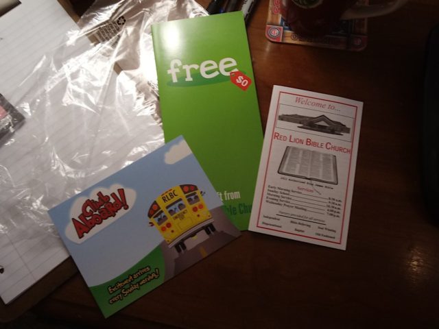 They were from a “Bible church” one town over. My neighbor used to attend. He’d even invite me to Easter services. I politely declined.