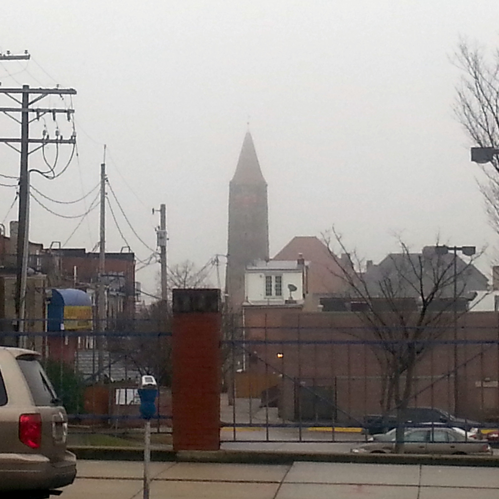 As I walked up Charles Street toward Hopkins, this massive spire rose out of the foggy mists. It was a striking spire — solid, a few windows, almost formless.